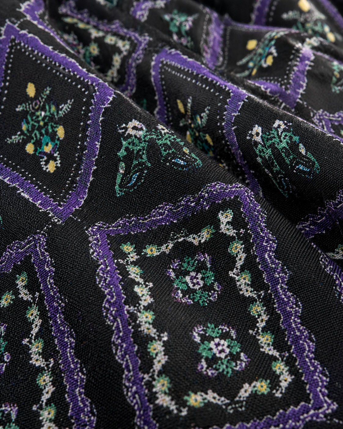 The V-neckline and long sleeves with ruffle cuffs complete a bold, textured look that pairs perfectly with dark jeans or trousers.