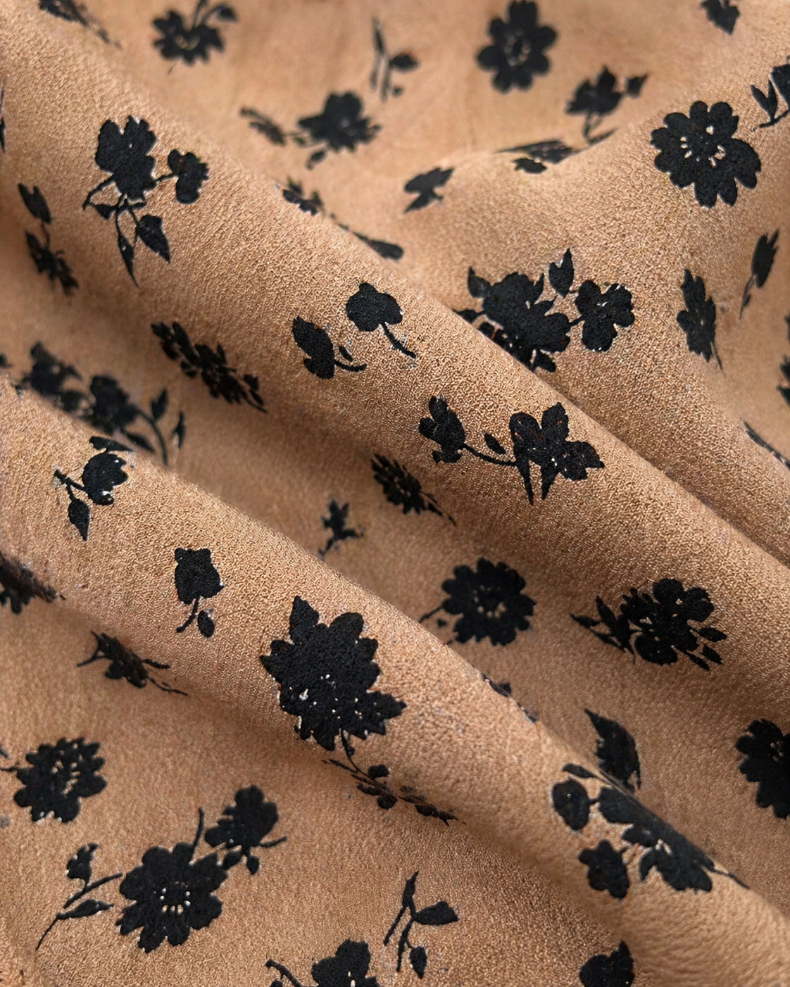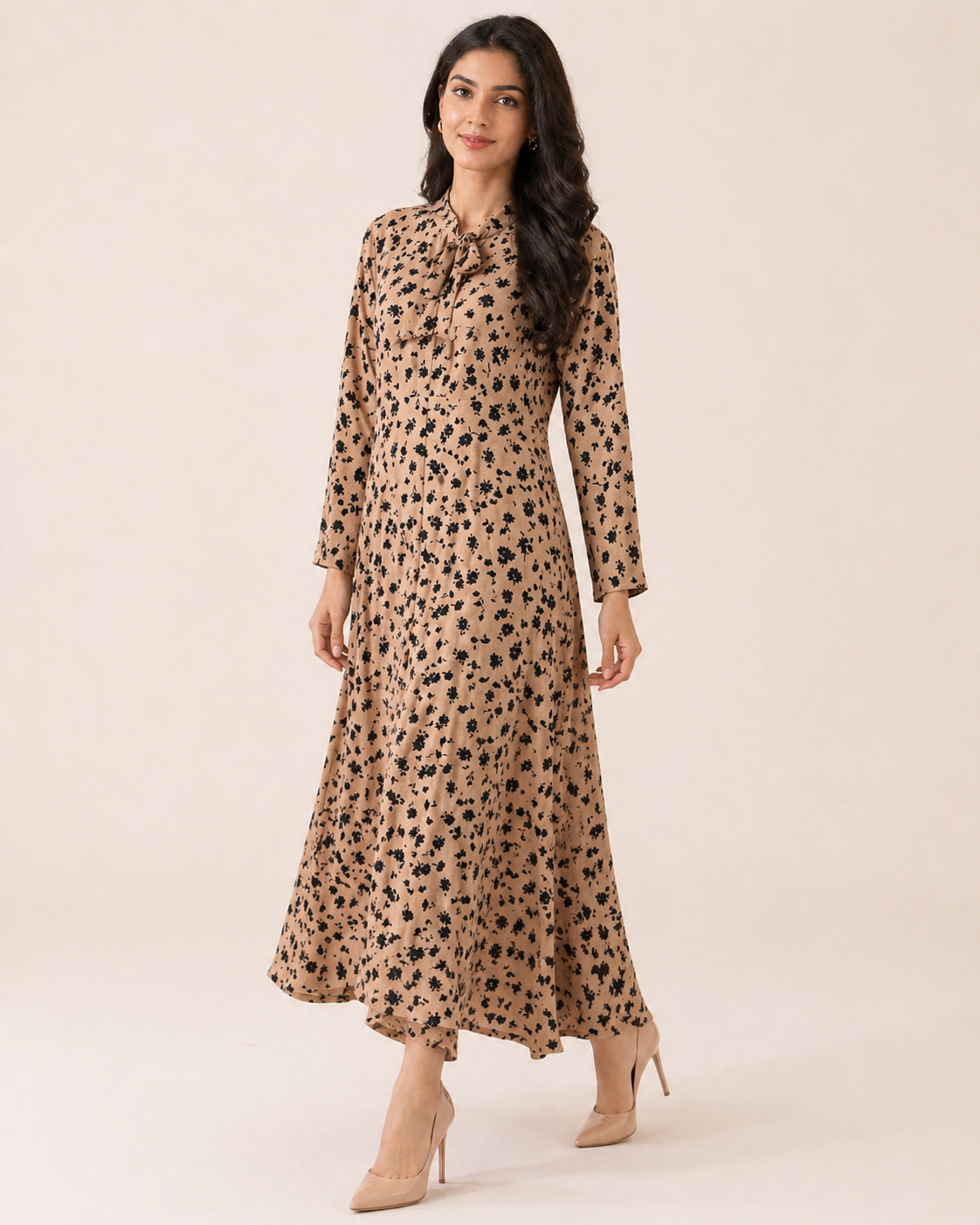A warm camel-toned maxi dress scattered with a delicate black floral print.