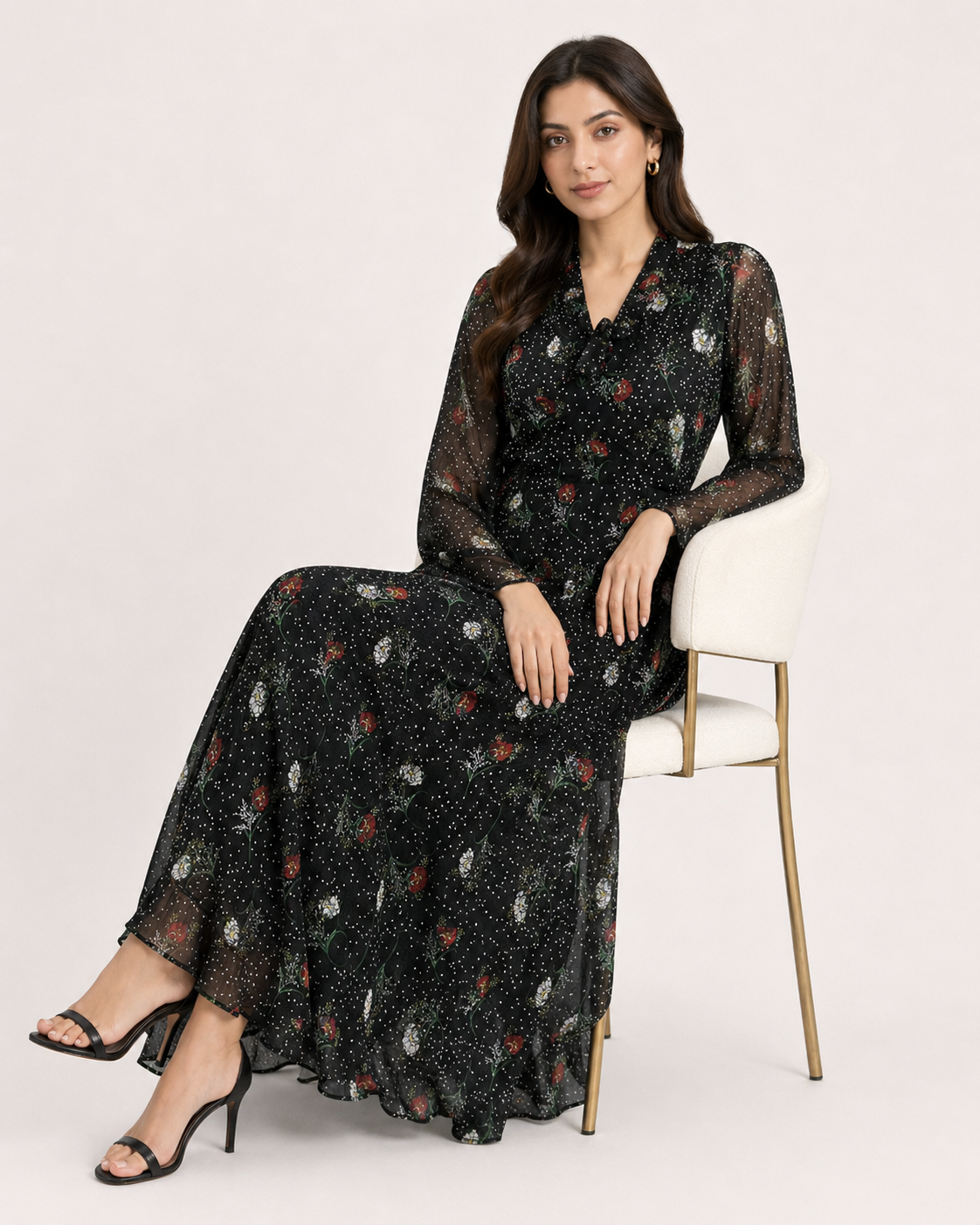 A graceful black chiffon maxi layered with a delicate multicolour floral scatter.