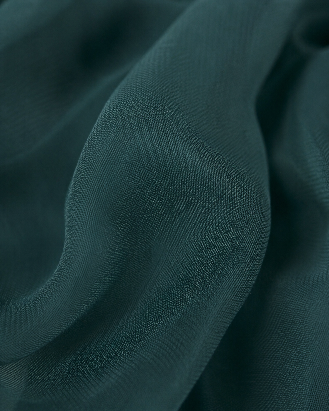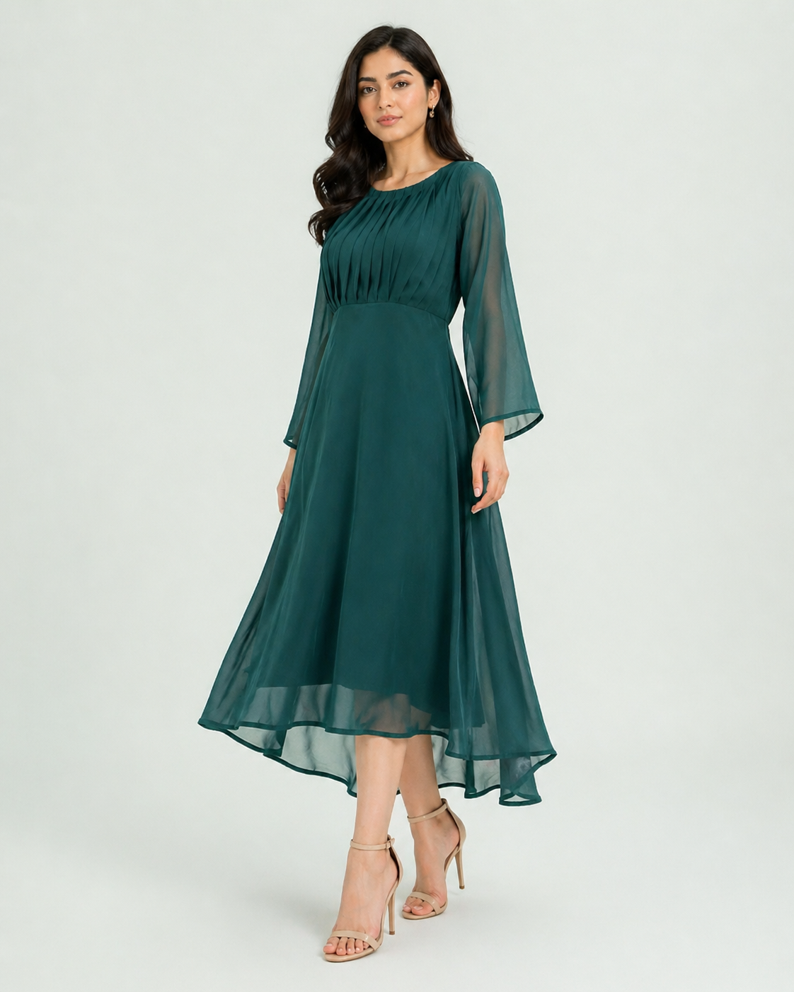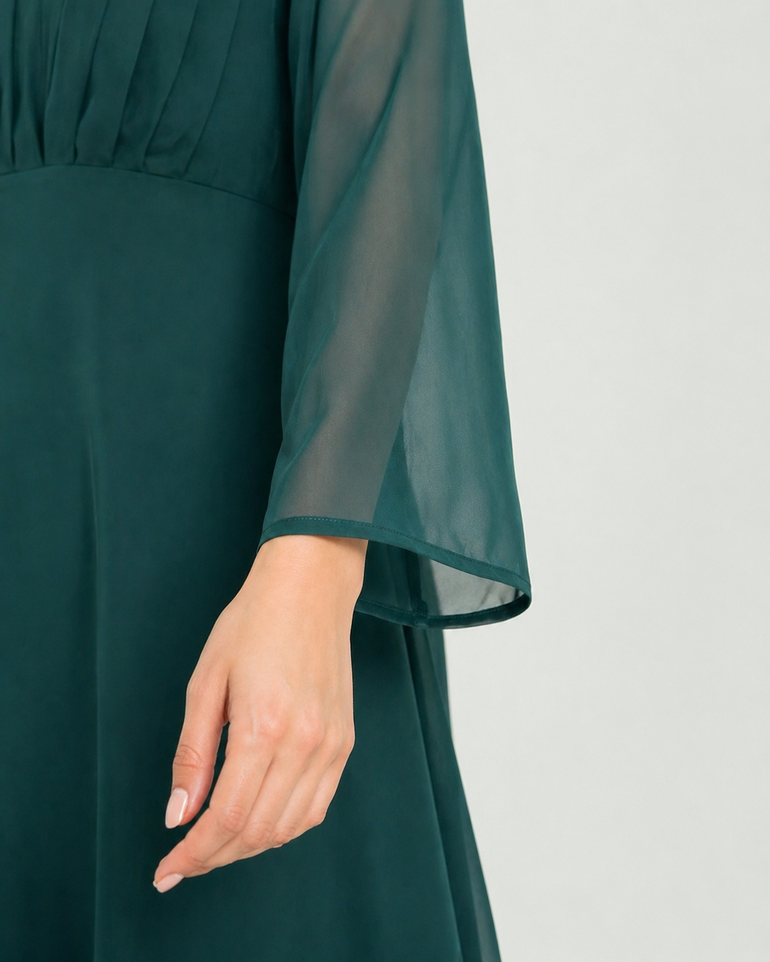 A sophisticated emerald green chiffon maxi with a subtly ruched neckline and long sheer sleeves.