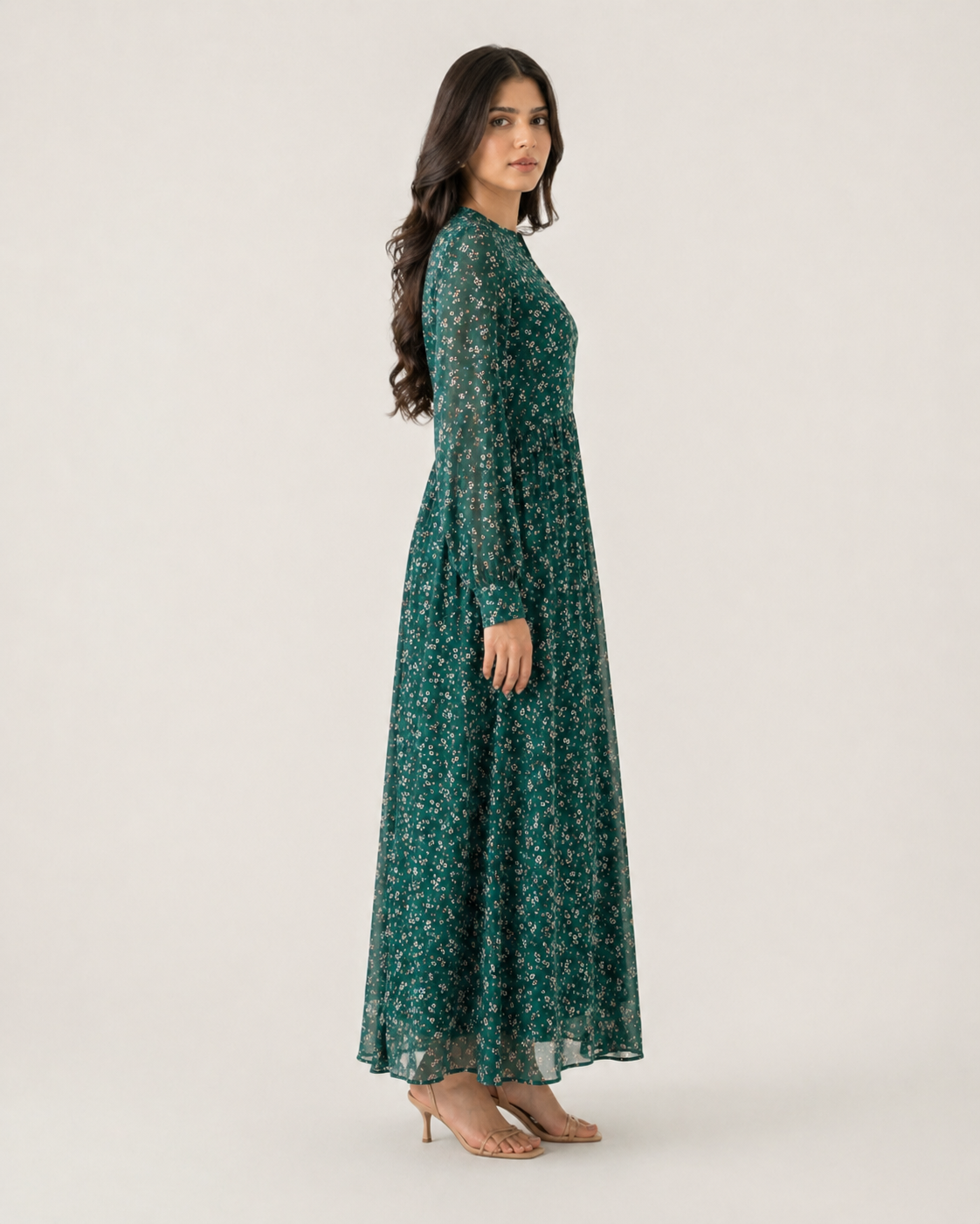 A fresh and effortlessly pretty everyday maxi in soft chiffon, dressed in a charming forest green ditsy floral print scattered with tiny white and pink blooms. The band neckline with a delicate front button placket adds a neat, polished finish, while the smocked waistband gives a naturally defined silhouette without any fuss. Long sleeves with softly gathered cuffs keep the look modest and graceful, and the full flared A-line skirt sweeps beautifully to the floor. Lightweight, airy, and endlessly wearable — perfect for casual outings, family gatherings, and relaxed festive occasions.
