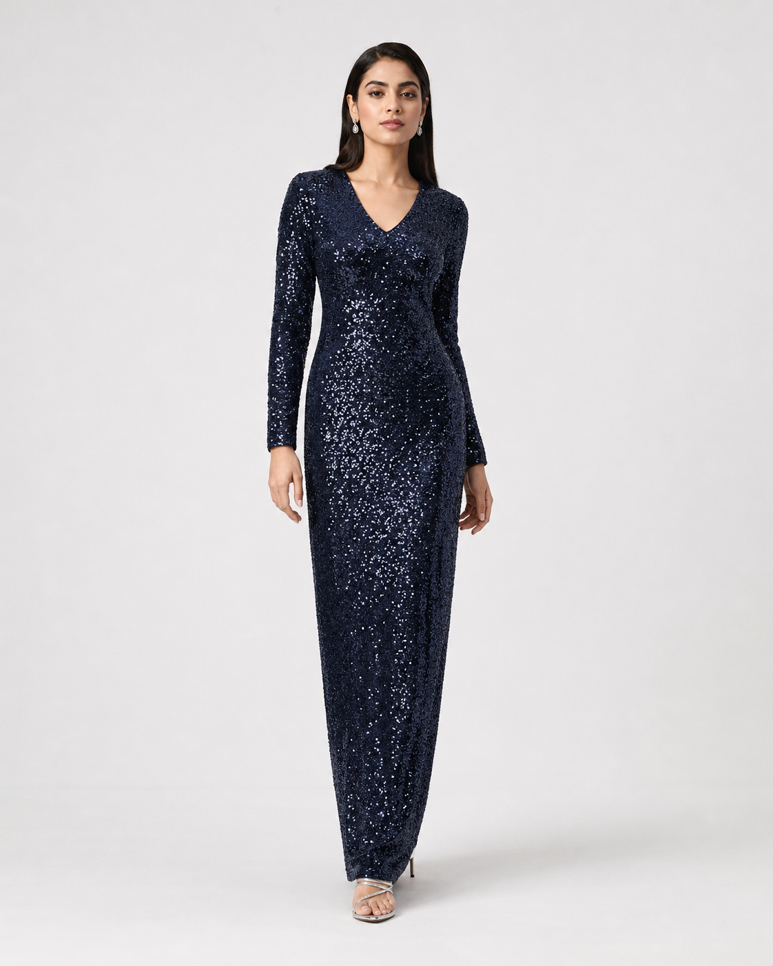 All-out glamour in deep navy blue. This showstopping allover sequin maxi is covered head to hem in lustrous sequins that catch and reflect light with every movement. The deep V neckline adds a bold, confident edge, while the long fitted sleeves keep the look sleek and polished. The body-skimming silhouette falls straight to the floor — no ruffles, no fuss, just pure sequin drama. This is the dress for formal dinners, wedding receptions, and any occasion that calls for maximum impact and zero compromise. Wear it, own it.