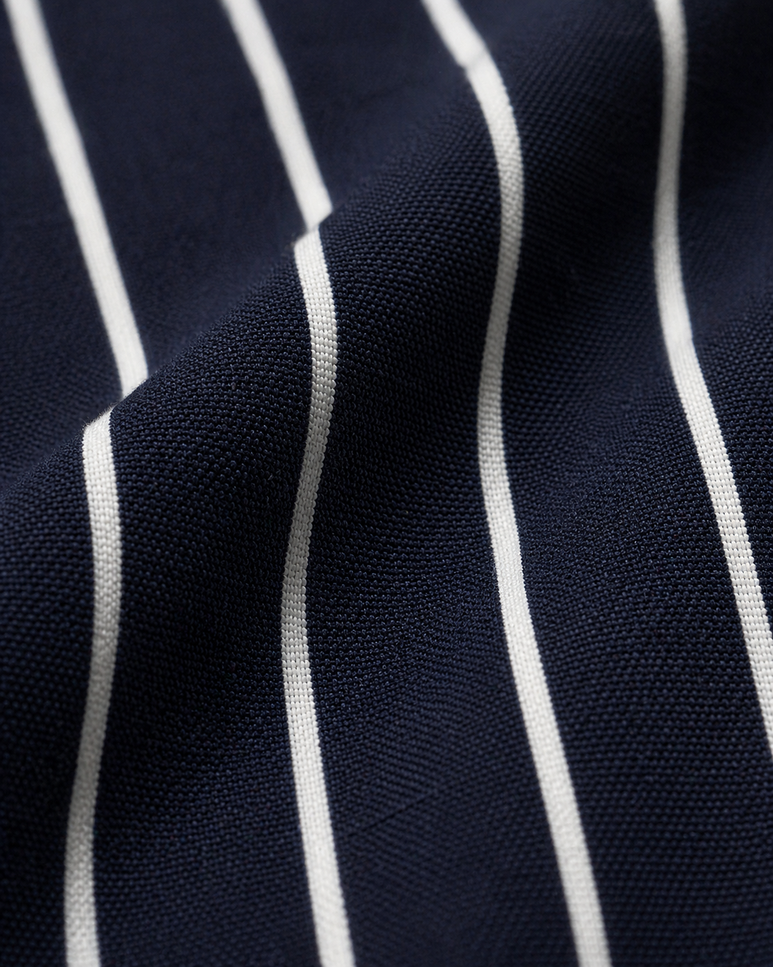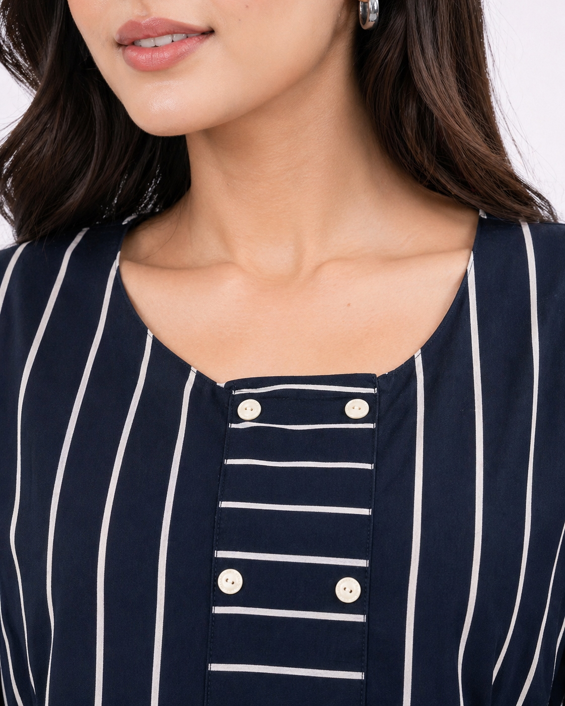 A sharp navy blue tunic with crisp white vertical stripes and a clean round neckline.