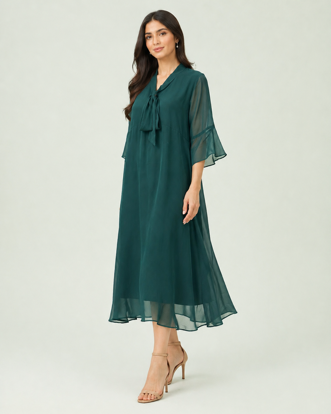 A rich teal chiffon maxi with a distinctive pussy-bow tie neckline and elegant flutter sleeves.
